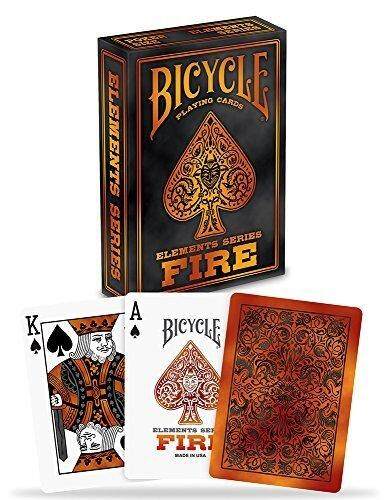 Bicycle playing cards elements Series fire brings a vintage card design back to life through the lens of fire Showcasing hues of Red and orange. This is the first in a Series of decks featuring vintage designs brought to life using one of the 4 elements. The card back is an updated version of the hobgoblin design from the renowned vanity Fair deck produced by the United States playing card company in 1895.