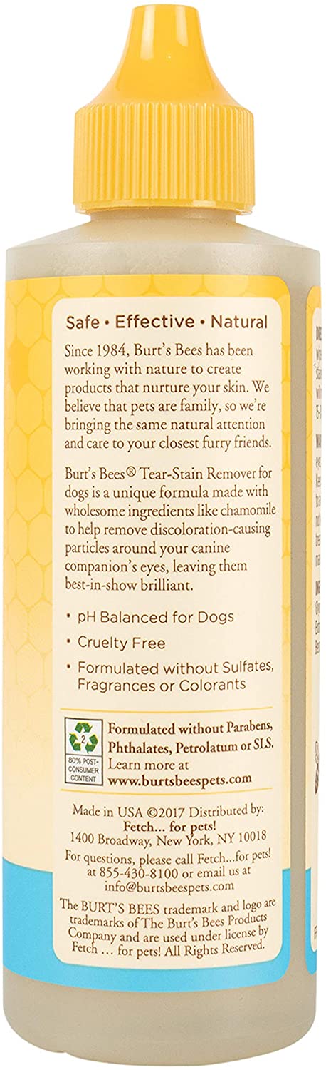 Since 1984, Burt's Bees has been working with nature to create products that nurture your skin. We believe that pets are family, so we're bringing the same natural attention and care to your closest furry friends. Tap into nature's powers with Burt's Bees Dog Tear Stain Remover made with Chamomile to remove stain-causing particles from fur around your dog or puppy's eyes. This unique formula is made with wholesome ingredients to help remove discoloration around your canine companion's eyes, leaving them best-in-show brilliant. The 99.9% natural formula is made with the highest quality ingredients. Burt's Bees Tear Stain Remover For Dogs is pH balanced especially for your dog or puppy and is made in the USA. Pet tear stain remover is 100% SAFE, and free of fragrances, sulfates, colorants, and harsh chemicals. DIRECTIONS: Saturate a cotton ball and wipe around your dog's eye, paying special attention to the tear stains. Use once daily. Because this product removes the stain-causing particles and not the stain itself, please allow 15-30 days for visible results. Store in a cool, dry place.