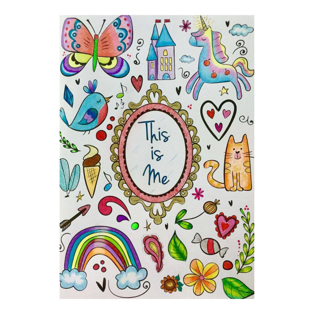 This book features hundreds of whimsical doodles, including: butterflies, nature scenes, an astronaut, unicorns, science scenes, trees, flowers, a castle, birds, ocean waves, animals, hearts, cats, rainbows, camping scenes, dragons, stars, a gardening scene, a microscope, a treehouse, a telescope, plants, a skyscraper, rockets, space scenes, a train, a superhero cape, musical instruments, art supplies, dolphins, bunnies, rock climbing, elephants, illustrated math equations, dancing , singing, swimming, biking, dogs, an exploration of inner beauty and much, much more!