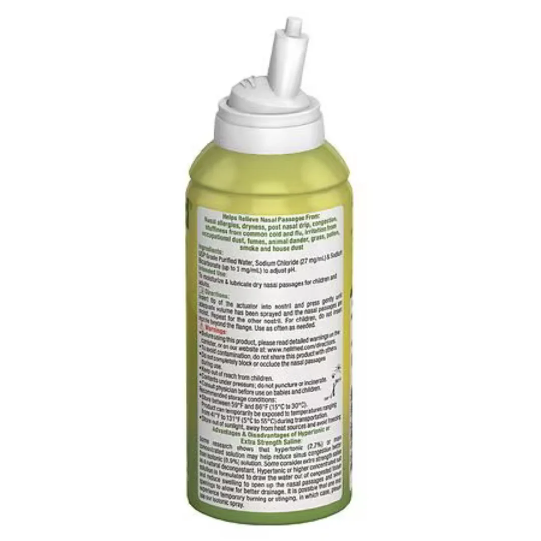 NasaMist Extra Strength Hypertonic Saline Spray is a sterile natural soothing saline spray. Applying a gentle fine mist in the nose is an excellent way to keep the nasal passages moist. NasaMist Saline Spray comes in isotonic, pediatric and hypertonic concentration. Nasal sprays should not be mistaken for large volume irrigation systems like Sinus Rinse Nasal Wash.